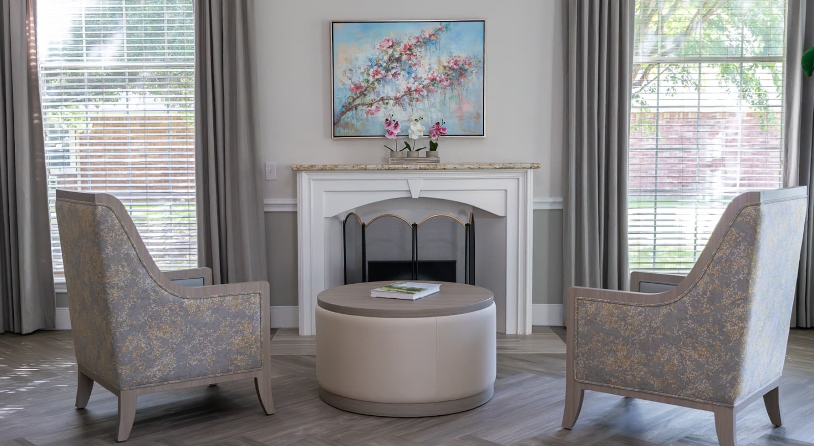 • a fireplace and two chairs