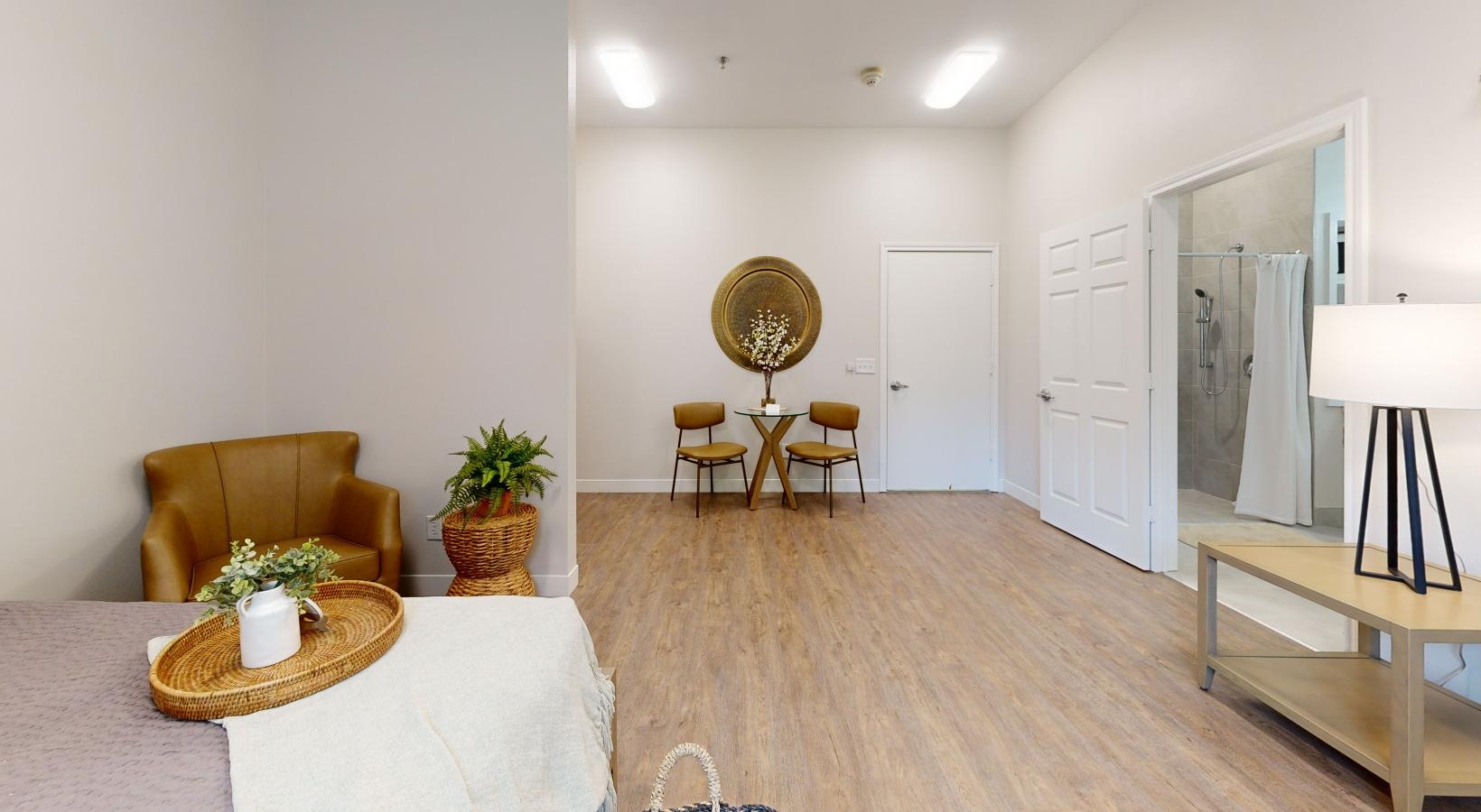 • a room with a wood floor and a round table and chairs and a lamp