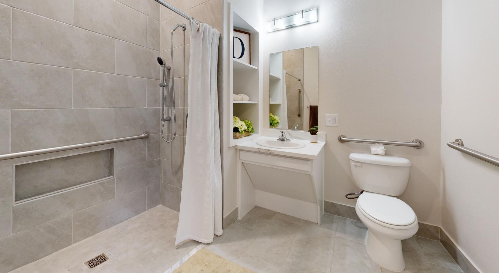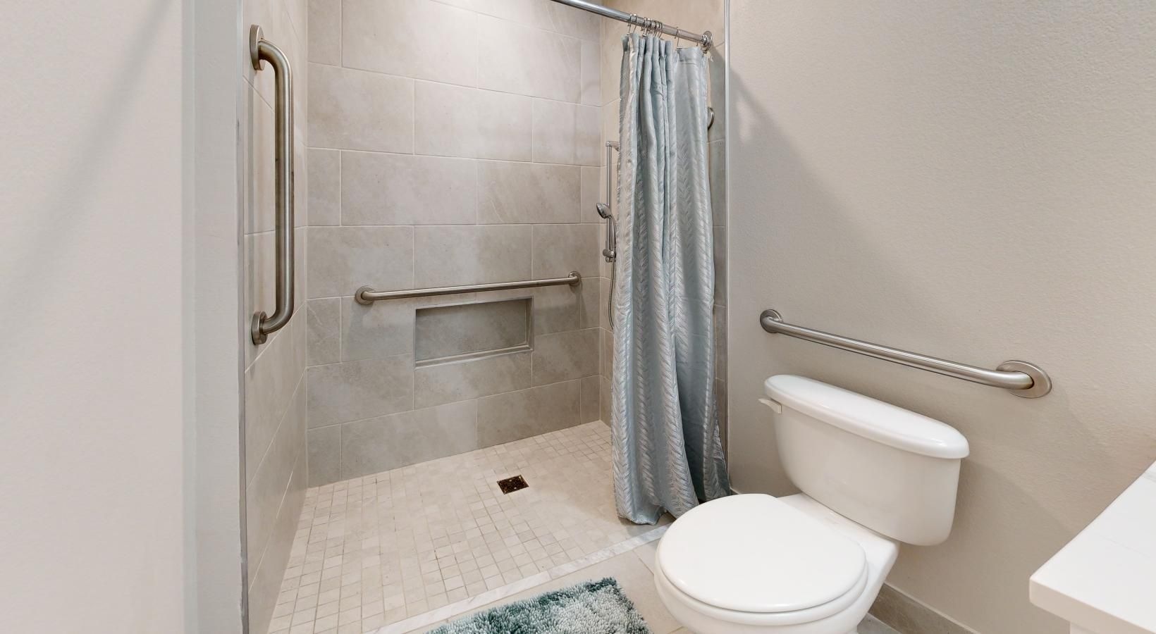 • a bathroom with a shower curtain